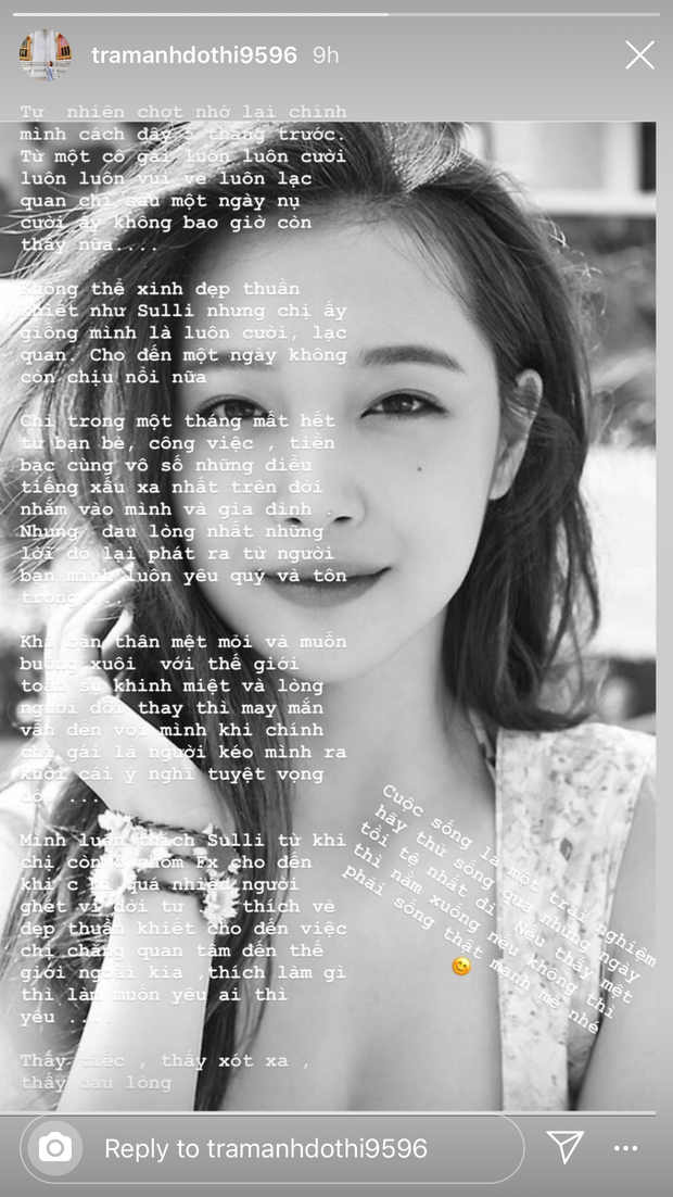 Mới đây, nhân sự việc đau lòng của Sulli, Trâm Anh cũng đã kịp có một bài đăng khá dài trên story. Cô nàng chia sẻ cảm giác của bản thân lúc này: bàng hoàng, xót xa, nuối tiếc cho một bông hoa rực rỡ đang độ tuổi đôi mươi như Sulli.