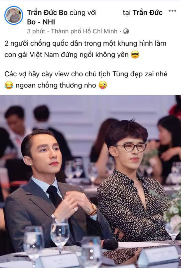 Trên Facebook cá nhân, Trần Đức Bo tự nhận mình và Sơn Tùng là 2 anh chồng quốc dân, ngoài ra cũng kêu gọi mọi người cùng cày view cho sếp dù MV Chúng Ta Của Hiện Tại đã ra đâu lâu lắc rồi. Nguyên văn: "2 người chồng quốc dân trong một khung hình làm con gái Việt Nam đứng ngồi không yên. Các vợ hãy cày view cho chủ tịch Tùng đẹp trai nhé, ngoan chồng thương nho".