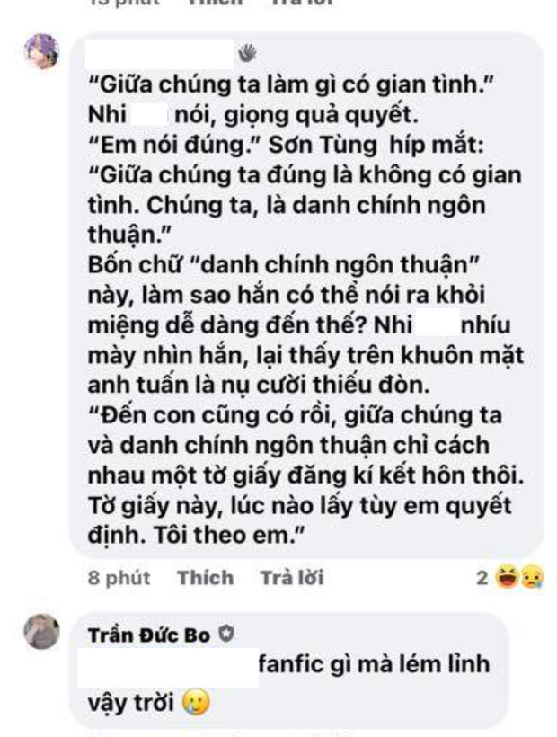 Được biết, bức ảnh này được fan của Trần Đức Bo chế trong nhóm fan của mình và được anh chàng đăng lại trên Facebook, ảnh gốc vốn dĩ Sơn Tùng ngồi cạnh trai đẹp "gà" công ty Kay Trần. Ngoài bức ảnh ghép, "người hâm mộ" của Trần Đức Bo còn chế thêm cả fanfic (truyện fan viết) về Sơn Tùng và Trần Đức Bo cho mọi người cùng đẹp.