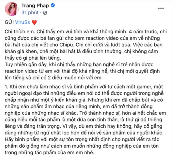 Giữa lúc cộng đồng mạng đang không ngừng xôn xao vì teaser MV comeback của Phí Phương Anh có những thông tin được cho là cà khịa ViruSs thì mới đây trên trang cá nhân, nữ ca sĩ/nhạc sĩ Trang Pháp đã đăng tải tâm thư khá dài với nội dung gửi trực tiếp đến nam streamer.