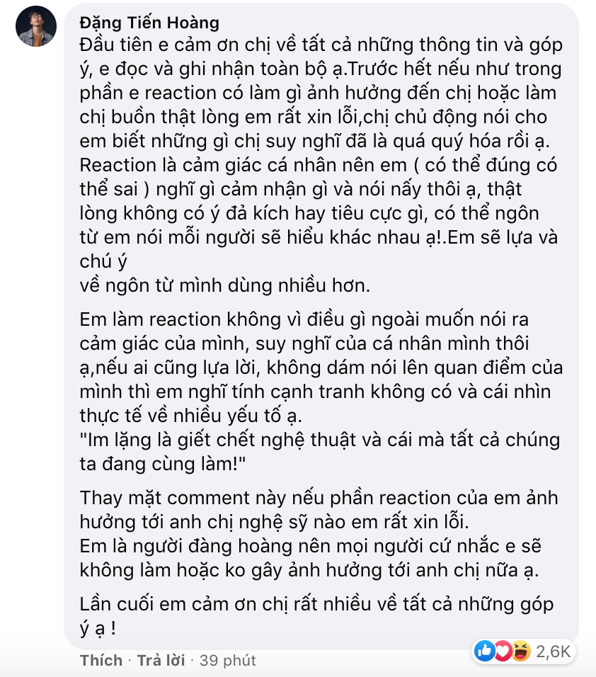 "Em làm reaction không vì điều gì ngoài muốn nói ra cảm giác của mình, suy nghĩ của cá nhân mình thôi ạ, nếu ai cũng lựa lời, không dám nói lên quan điểm của mình thì em nghĩ tính cạnh tranh không có và cái nhìn thực tế về nhiều yếu tố ạ. Im lặng là giết chết nghệ thuật và cái mà tất cả chúng ta đang cùng làm!".
