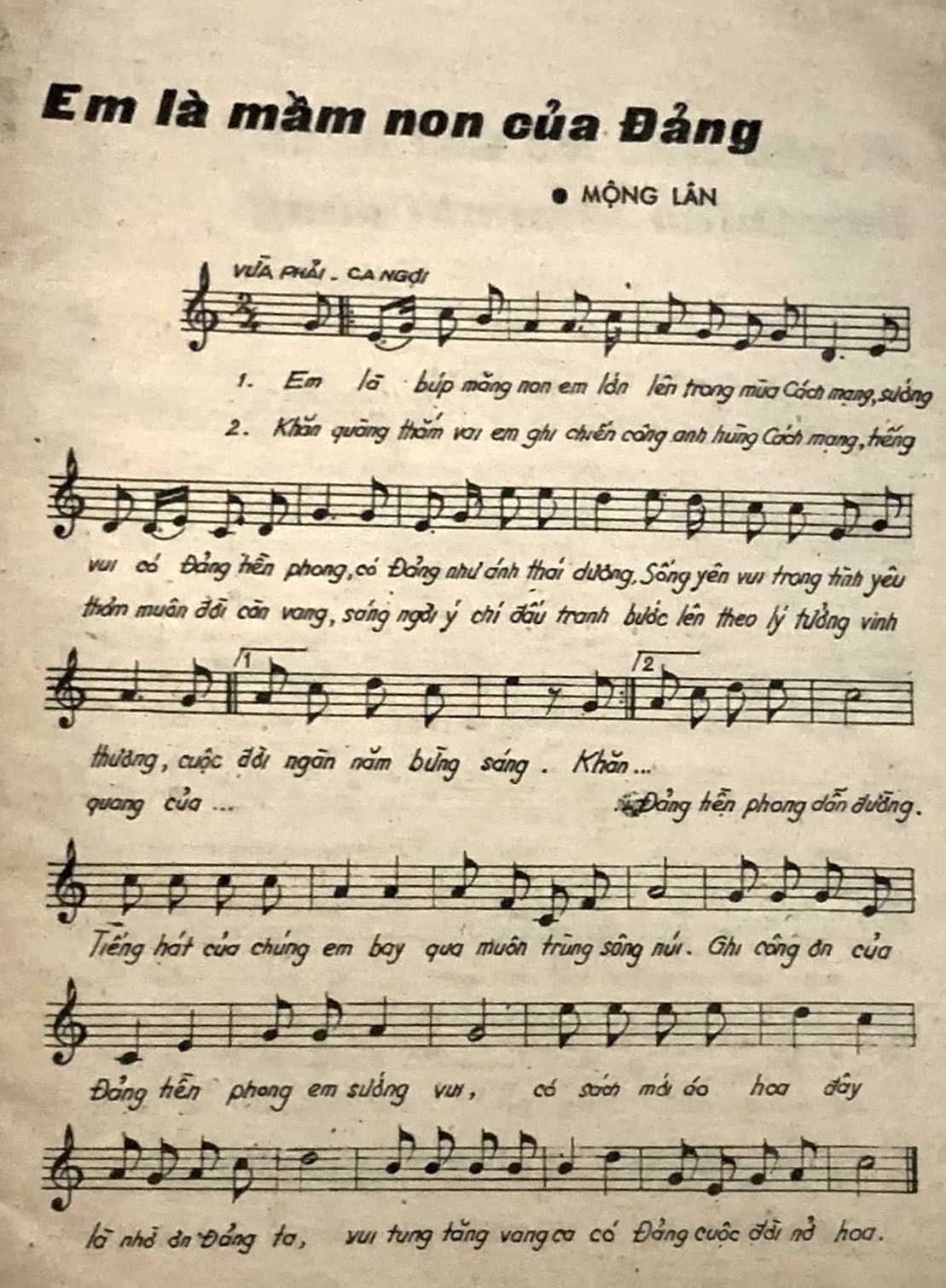 Em là mầm non của Đảng được nhạc sĩ Mộng Lân sáng tác năm 1958. Ca từ trong bài hát mộc mạc, giản dị, phản ánh cuộc sống thời thơ ấu tươi vui, hồn nhiên.