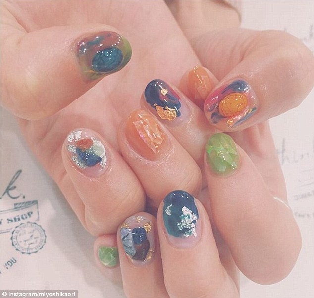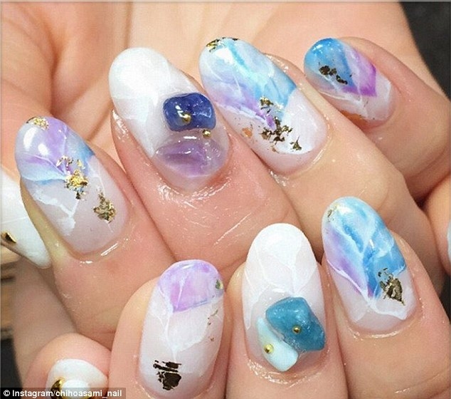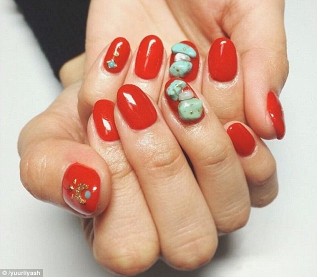 Yuurilliyaah, một người dùng Instagram vừa khoe bộ móng đỏ của mình với một viên đá nhỏ gắn trên. Trong khi đó, Sty_nail khoe móng tay trắng, vẽ vàng để tạo hình khối như đá nứt.