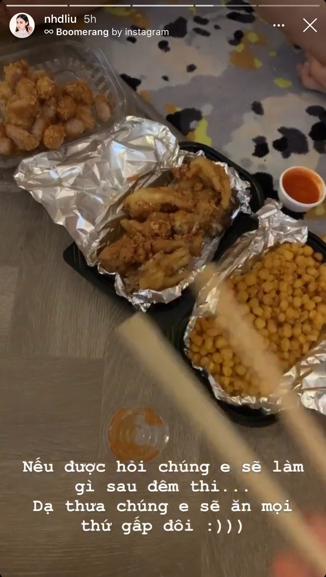 Trước đó, trên story Instagram của mình, Diệu Linh cũng đã bật mí hậu trường rất thú vị sau vòng Bán kết cam go. Sau đêm thi, các người đẹp đã tự thưởng cho mình một bữa ăn ngon lành. Diệu Linh đã đăng ảnh một bàn đầy ắp toàn các món ăn vặt ngon lành như: nem chua rán, chân gà rang muối, ngô chiên...