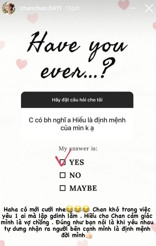 Trong lần trả lời thắc mắc của fan này, Xoài Non cũng khẳng định thiếu gia streamer Xemesis chính là định mệnh cuộc đời mình. Cô nói: Chan khá khó trong việc yêu ai mà lập gia đình lắm. Hiếu cho Chan cảm giác mình là vợ chồng. Đúng như bạn nói là khi yêu nhau, người ta nhận ra người bên cạnh là định mệnh đời mình.