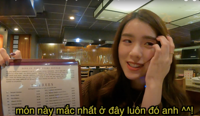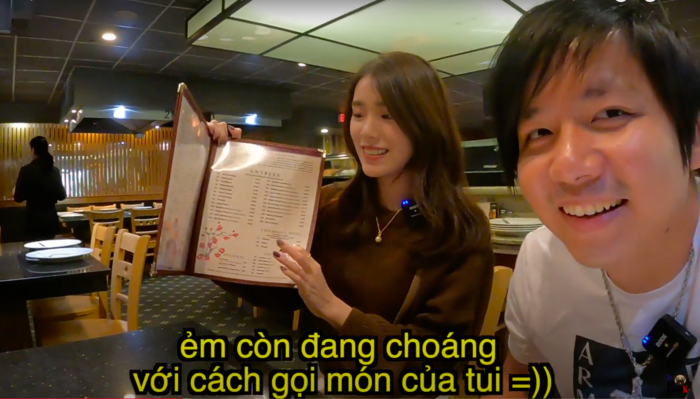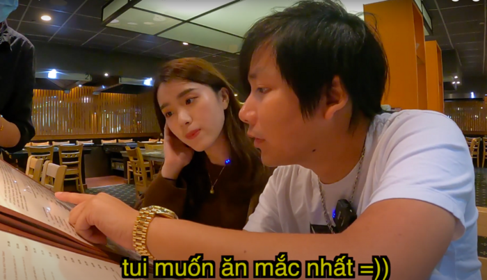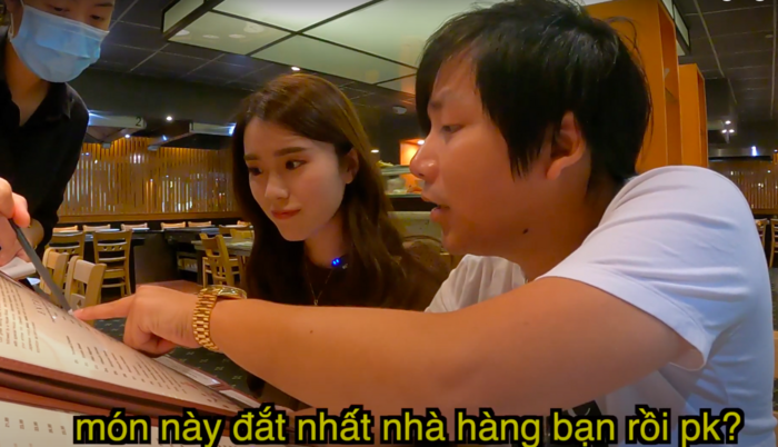 Cô “bạn gái người Nhật” tỏ ra ngại ngùng và có chút giật mình khi thấy Khoa Pug gọi món đắt nhất: "Món này đắt nhất ở đây đấy anh ơi". Khoa Pug liền tung “thính”: "Anh gọi cho em đó".