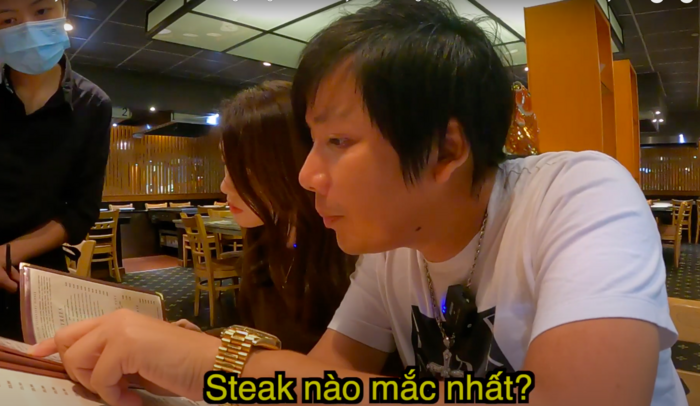 “Bạn có thể tư vấn món nào mắc nhất ở đây không? Steak nào mắc nhất?". Sau khi được tư vấn, Khoa Pug “chốt hạ” món đắt nhất trong nhà hàng trước sự ngỡ ngàng của Mayuko.