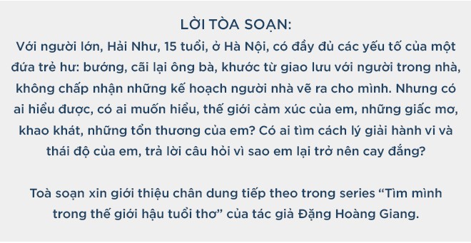 Tôi mới mười lăm tuổi, nhiều khi tôi tức giận với những đứa trẻ may mắn hơn mình. Một đứa bạn tôi thích vẽ manga, nó được bố mẹ mua hẳn cho một cái bảng vẽ điện tử, được cho tiền đi học vẽ. Tại sao tôi không được như nó? Cuộc sống của tôi như là trong địa ngục. Tôi ở ngoài đường suốt, về nhà thì cố thủ trong phòng, không chịu xuống ăn cùng ông bà.