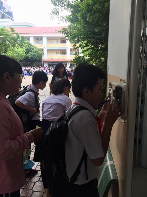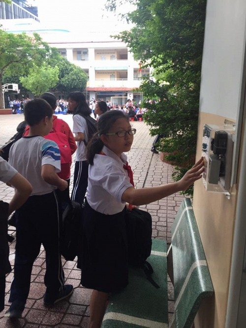 Máy chấm điểm danh được bố trí ngay cổng ra vào sân trường. |