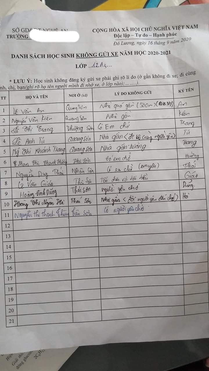 Nếu các lớp học khác thường đưa ra lý do thông thường như: Nhà gần, không có xe... thì mới đây, lớp học 12A3 ở trường THPT Đô Lương 3 (Nghệ An) đã gây bão vì lý do hết sức hài hước. Mỗi người một lý do nhà gần, có bạn chở nhưng tất cả lại có điểm chung đều liên quan đến người yêu như: Muốn đi bộ cùng em ấy, bạn trai qua đón...