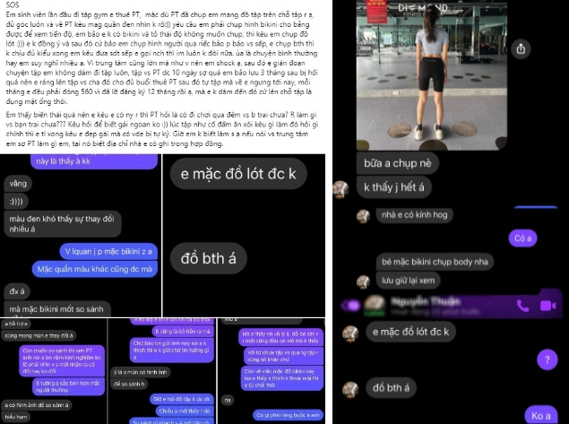 Mới đây, một nữ sinh tên Đ.N đã tố cáo PT tại một phòng gym có những hành động không đúng mực. Không chỉ yêu cầu cô mặc bikini, đồ lót chụp ảnh gửi người này mà PT này còn có những lời lẽ mang đầy tính gạ gẫm, thậm chí có thể gọi là quấy rối tình dục cũng không ngoa.