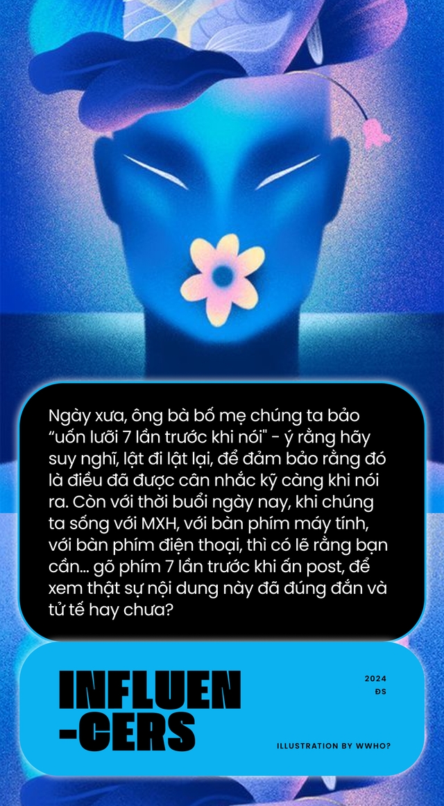 Làm một người có sức ảnh hưởng không chỉ là được nghìn like cho một bức hình hay hàng triệu view cho một video, đó còn là sự tinh tế khi nhận biết được đâu là thứ mình có thể làm và đâu là thứ mình phải thể hiện sự nghiêm túc và chân thành. Bạn cần nhiều kiến thức xã hội hơn là mờ mắt chạy theo để tóm nhanh một sự kiện có vẻ như đang là trào lưu hot. Bạn cần sự hiểu biết để ngồi xuống cân nhắc xem mình nên tiếp cận với nội dung này như thế nào để phù hợp với tính chất và thời điểm nào là hợp lý. Ngày xưa, ông bà bố mẹ chúng ta bảo “uốn lưỡi 7 lần trước khi nói" - ý rằng hãy suy nghĩ, lật đi lật lại, để đảm bảo rằng đó là điều đã được cân nhắc kỹ càng khi nói ra. Còn với thời buổi ngày nay, khi chúng ta sống với MXH, với bàn phím máy tính, với bàn phím điện thoại, thì có lẽ rằng bạn cần… gõ phím 7 lần trước khi ấn post, để xem thật sự nội dung này đã đúng đắn và tử tế hay chưa?