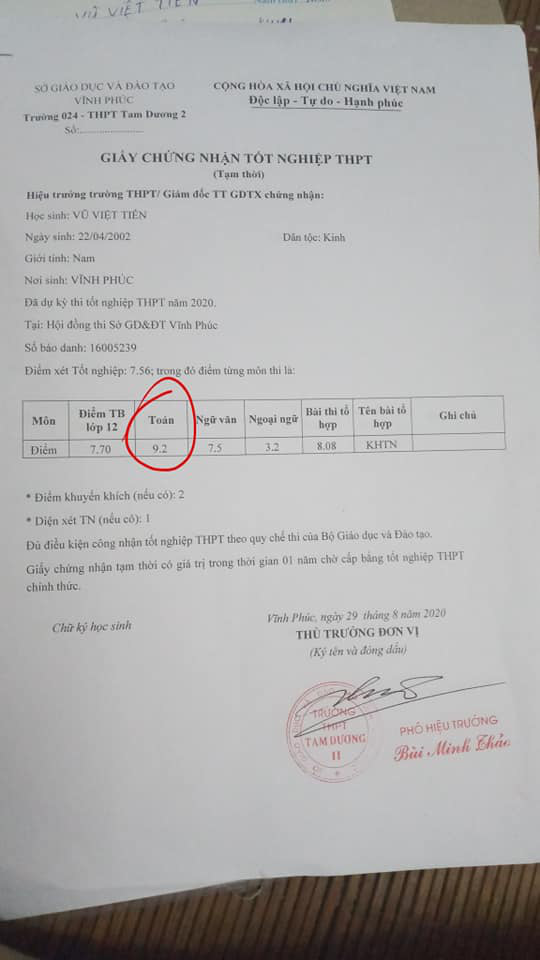 Trong kỳ thi tốt nghiệp THPT Quốc gia vừa diễn ra, cậu bạn này đã đạt số điểm cao chót vót ở môn Toán (9,2 điểm), nam sinh cũng tự tin đăng ký làm bài thi tự nhiên ở môn tổ hợp và cũng đạt thành tích 8,08 cho 3 môn. Điều này khiến mọi người vô cùng sửng sốt, nhất là khi cậu bạn còn từng là một học sinh vô cùng yếu Toán.