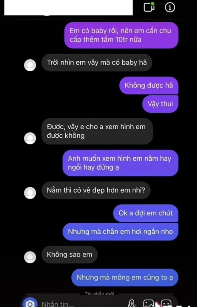Đoan Minh - cô gái với 12 mối tình và đòi bồ tương lai phải cho tiền đầu tư trong màn tuyển người yêu gây bão MXH là nhân vật mới nhất gặp phải chuyện gạ tình. Cụ thể, cô nàng đã đăng tải những dòng tin nhắn bị một người nào đó đề nghị làm sugar baby và hứa chu cấp 10 triệu/ tháng.