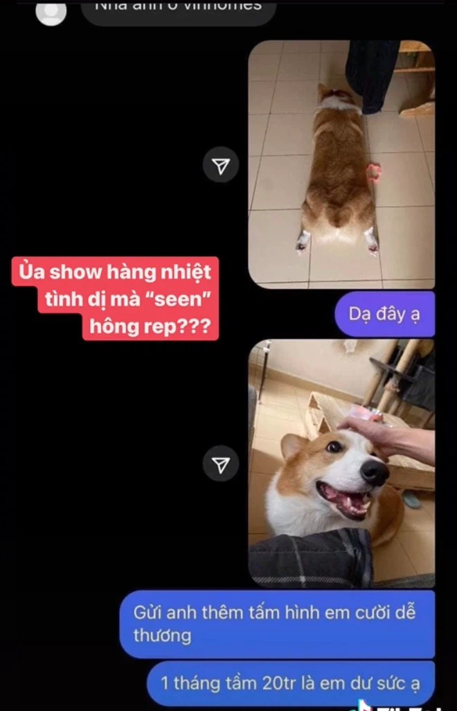 Sau khi người đàn ông ok với điều kiện của Đoan Minh và muốn xem ảnh chính chủ, cô liền gửi ngay hình "chân ngắn", "mông to" của chó cưng nhà mình qua. Rất nhanh tay, sugar daddy đã cho Đoan Minh một vé block, không hẹn ngày trò chuyện lại.