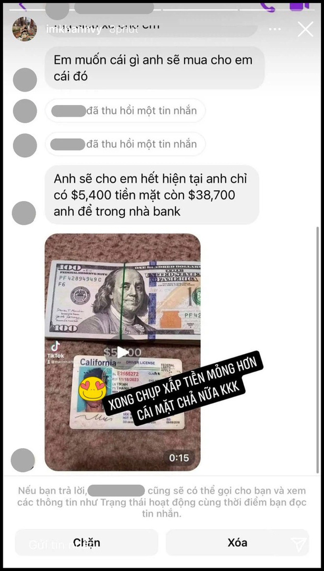 Khánh Vy, bà xã Phan Mạnh Quỳnh lại nhận về hàng loạt tin nhắn spam từ người đàn ông lạ mặt.