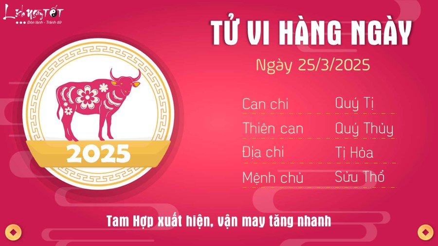 Ngày 25/3/2025, vận may của người tuổi Sửu có xu hướng tăng nhanh trong ngày được cục diện Tam Hợp che chở. Công việc suôn sẻ, nhân duyên tốt giúp bạn dễ nhận được sự hỗ trợ từ đồng nghiệp, cấp trên hoặc đối tác, giúp mọi kế hoạch diễn ra đúng như mong đợi.
