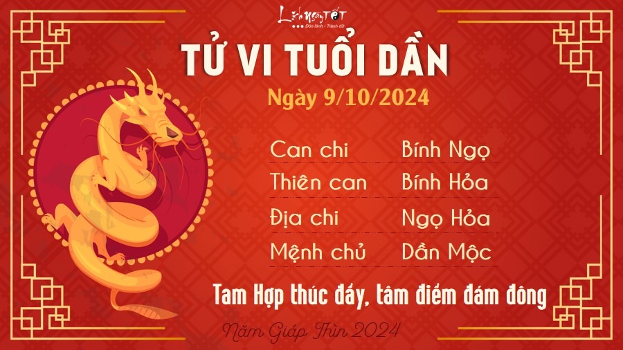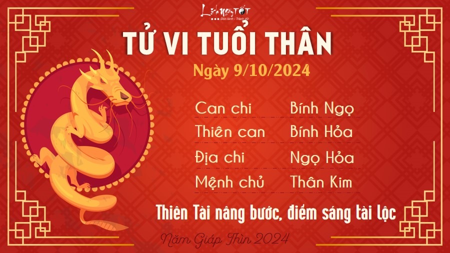 Tử vi hàng ngày 9/10/2024 của 12 con giáp thấy, Hỏa sinh Thổ, người tuổi Thìn được tận hưởng hạnh phúc trong ngày hôm nay. Bạn dũng cảm đối diện với cảm xúc của mình và điều đó khiến nửa kia rất trân trọng.