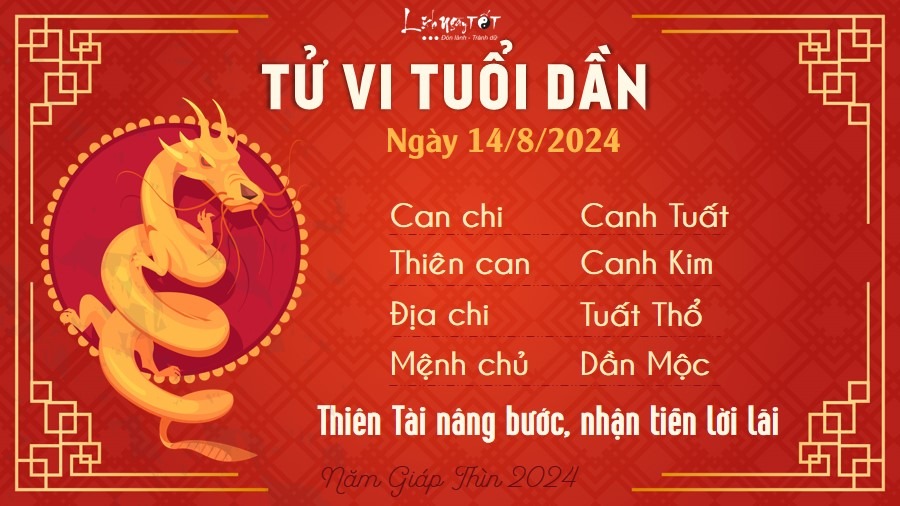 Theo tử vi hàng ngày 14/8/2024 của 12 con giáp, Thiên Tài nâng bước, con đường tài lộc của người tuổi Dần có những bước tiến rực rỡ trong ngày hôm nay. Bạn nhận được tiền lời lãi từ những mối đầu tư trước đó.