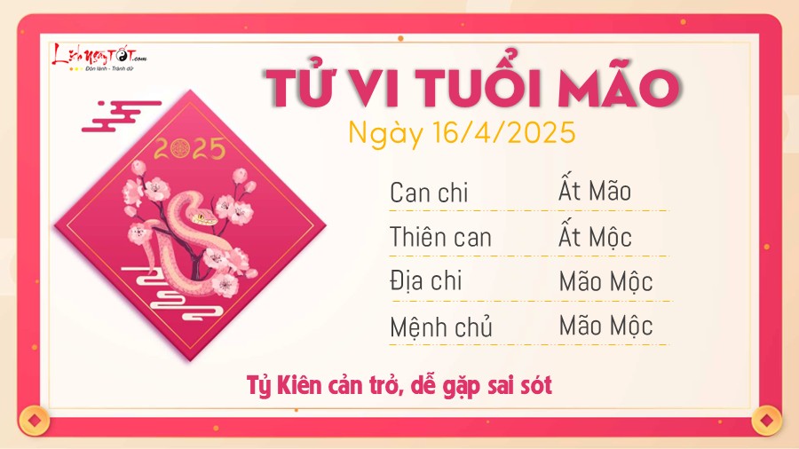Tử vi hàng ngày dự báo có Tỷ kiên cản trở, hôm nay là một ngày đòi hỏi sự kiên nhẫn của tuổi Mão. Sự vội vàng chỉ dẫn tới nhiều sai lầm hơn trong công việc hiện tại. Hãy tin rằng thời gian sẽ mang lại cho chúng ta câu trả lời tốt nhất, Mão càng hấp tấp càng hỏng việc, hãy lưu tâm điều này.