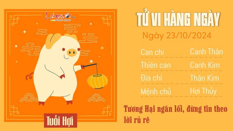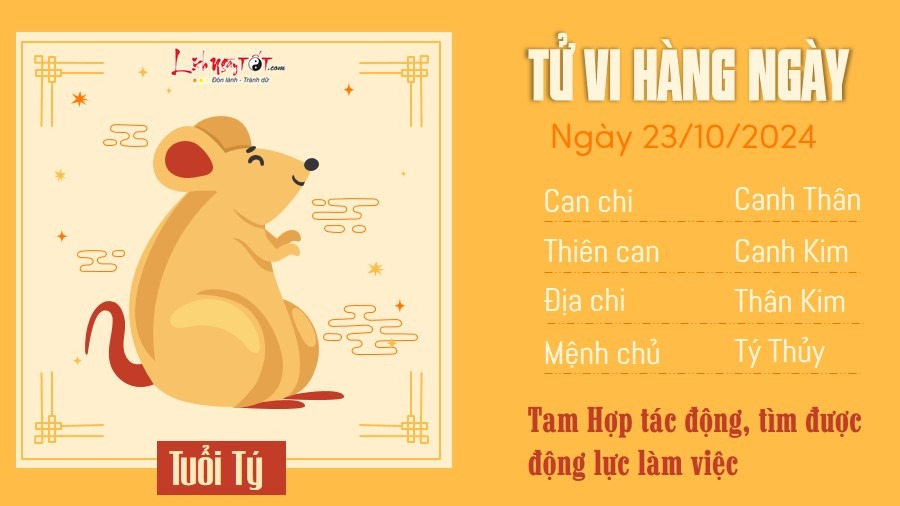 Xem tử vi hàng ngày 23/10/2024 của 12 con giáp, Tam Hợp tác động, người tuổi Tý tìm được động lực để làm việc trong ngày hôm nay. Bạn không ngần ngại bắt tay vào các công việc khó và học hỏi được nhiều kiến thức hữu ích.