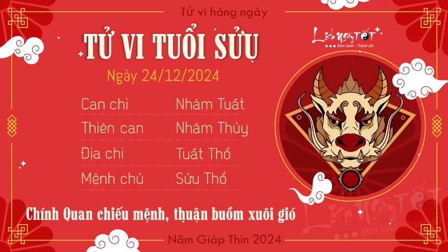 Tiếp nối tử vi hàng ngày 23/12/2024, người tuổi Sửu nhờ có sự giúp sức của Chính Quan nên công việc thuận buồm xuôi gió, làm tới đâu thấy thành quả tới đó. Bạn cũng có nguồn động viên tinh thần lớn từ cấp trên, đối phương luôn tin tưởng trao cho bạn cơ hội để làm việc đúng chuyên môn.