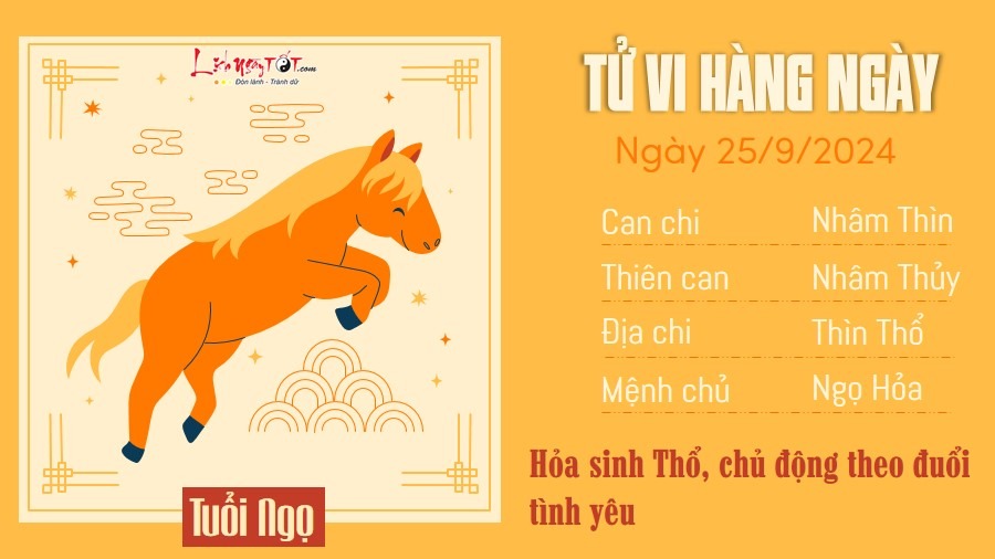 Xem tử vi hàng ngày 25/9/2024 của 12 con giáp, Hỏa sinh Thổ, người tuổi Ngọ đã chủ động hơn trong việc theo đuổi tình yêu. Bạn tìm cách để kéo gần khoảng cách với người mà mình yêu mến.