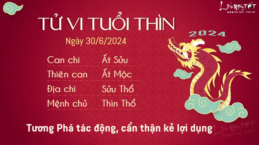 Xem tử vi hàng ngày 30/6/2024 của 12 con giáp, cục diện Tương Phá tác động, người tuổi Thìn cần cẩn thận trước nguy cơ có kẻ tiếp cận để lợi dụng mình. Tốt hơn hết bạn nên tự mình làm việc và đừng để mình bị cuốn theo những lời ngon tiếng ngọt.
