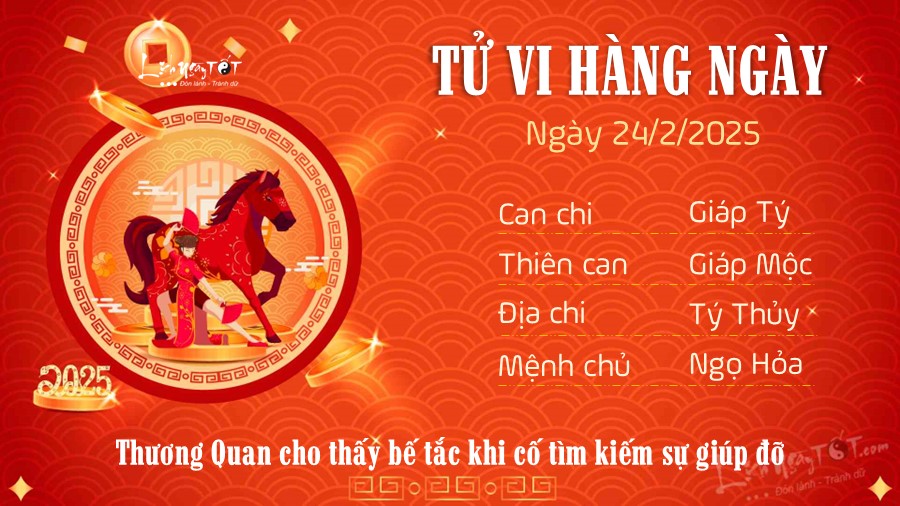 - Tử vi tuổi Mậu Ngọ (Hỏa, 48): Hôm nay không nên ra quyết định cho những việc quan trọng vì ngày 24/2/2025 là ngày Tam nương sát. Tốt nhất là dừng lại kế hoạch khai trương, xuất hành, cưới hỏi, sửa chữa hay cất nhà... sang thời điểm phù hợp hơn.