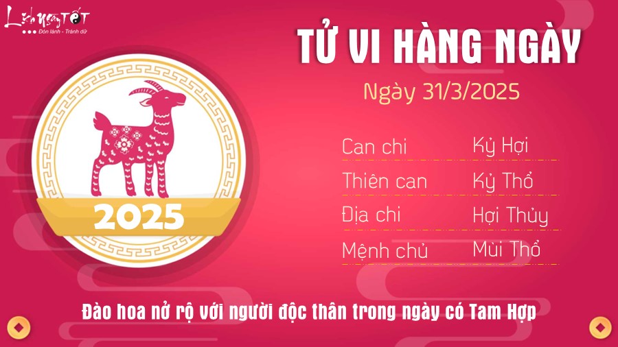 Tử vi hàng ngày 31/3/2025 của 12 con giáp, đào hoa nở rộ đối với tuổi Mùi độc thân trong ngày có Tam Hợp soi đường chỉ lối. Còn người đã có gia đình thì êm ấm thuận hòa, điều này càng tạo ra động lực khiến tình cảm ngày càng phát triển.