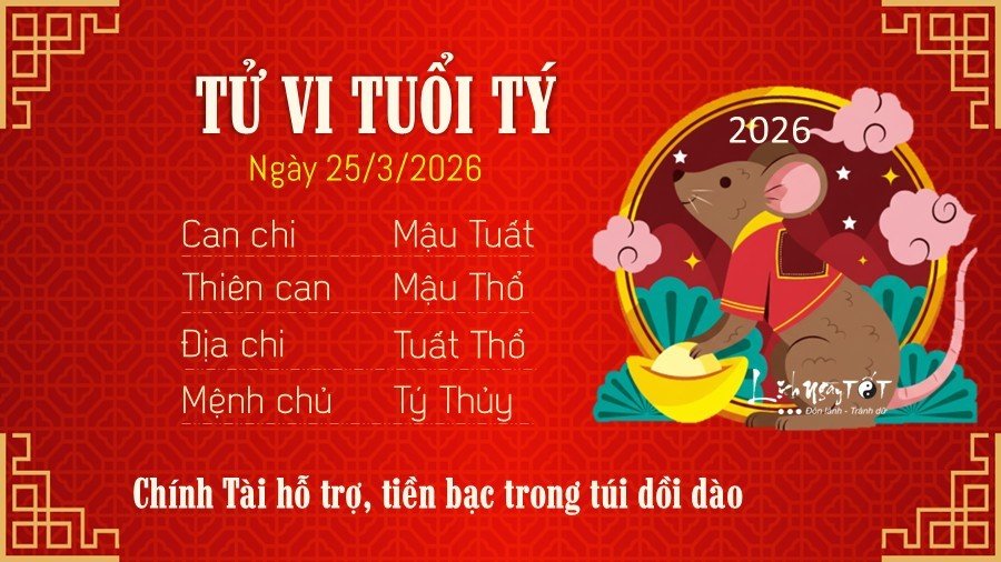 Tiếp nối tử vi ngày 24/3/2026, Chính tài hỗ trợ, công việc làm ăn kiếm tiền của người tuổi Tý khá hanh thông, vượng lộc trong ngày này. Cuối ngày khả năng làm giàu của Tý lên cao, sẽ có những khoản tiền bất ngờ đến với bạn, nhưng hãy cẩn thận đừng tiêu xài quá mức kẻo lại cháy túi, có lộc nhưng cũng phải biết giữ thì mới bền được.