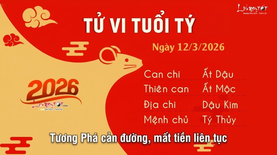 Tiếp nối tử vi ngày 11/3/2026 , Thiên ấn chiếu mệnh, Tý muốn thành công trong ngày này thì cần mềm mỏng, bớt soi xét, bớt khó tính. Tý là người thắng lợi nhiều mà thất bại cũng lắm, tinh thông tay nghề, phản ứng nhanh nhậy, nhiều tài nghệ, nhưng dễ cô độc bị người khác ghen ăn tức ở dèm pha sau lưng mà không hề hay biết.