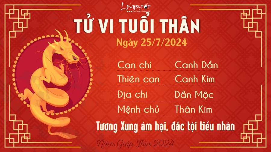 Theo tử vi hàng ngày 25/7/2024 của 12 con giáp, Mộc khắc Thổ, người tuổi Thìn nên xem lại cách hành xử của mình với nửa kia. Bạn không nên cho mình là trung tâm của mối quan hệ và muốn người ấy phải chiều theo mọi việc.