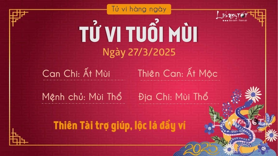 Tiếp nối tử vi ngày 26/3/2025, Thiên ấn chiếu mệnh, Tý có nhiều niềm vui trong công việc hiện tại và được sự tín nhiệm của lãnh đạo. Ngày này rất nhiều may mắn tìm tới những bạn làm quản lý, có chức quyền địa vị trong xã hội, kỹ thuật, in ấn, thủy sản, mọi sự đều được thần may mắn đi theo giúp đỡ.