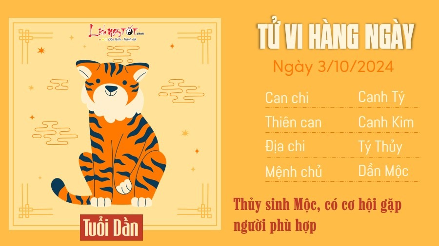 Theo tử vi hàng ngày 3/10/2024 của 12 con giáp, Thủy sinh Mộc, đào hoa nở rộ trong vận trình tình cảm của người tuổi Dần trong ngày hôm nay. Người độc thân có thể vô tình gặp được người phù hợp. Hai người chỉ vừa tiếp xúc mà như đã quen từ lâu.