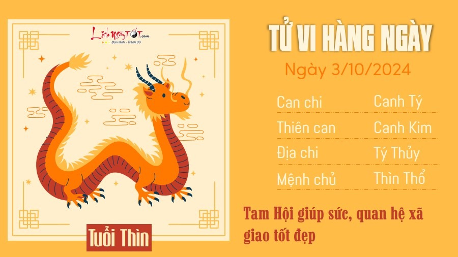Tử vi hàng ngày 3/10/2024 của 12 con giáp thấy, Tam Hợp giúp sức, người tuổi Thìn xây dựng được những mối quan hệ tốt đẹp với bạn bè, đồng nghiệp xung quanh. Mọi người cùng hợp sức để hoàn thành những công việc chung.