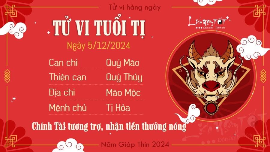 Chính Tài tương trợ, người tuổi Tị nhận những tin tức tích cực trên phương diện tài lộc trong ngày hôm nay. Người làm công ăn lương hoàn thành xuất sắc nhiệm vụ được giao nên được nhận tiền thưởng nóng.