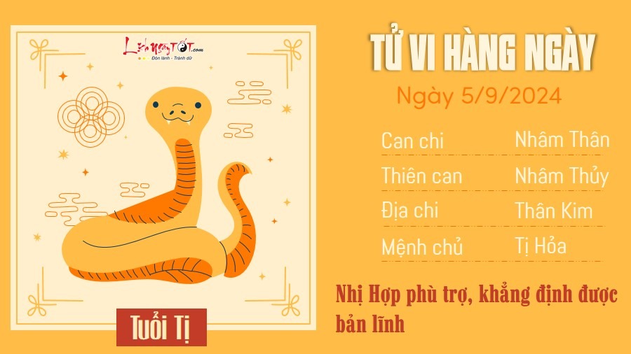Tử vi hàng ngày 5/9/2024 của 12 con giáp thấy rằng, do có Nhị Hợp phù trợ, người tuổi Tị biết mình cần phải làm gì để khẳng định bản lĩnh trong ngày hôm nay. Bạn luôn tỏ ra tích cực và chủ động trong mọi công việc.