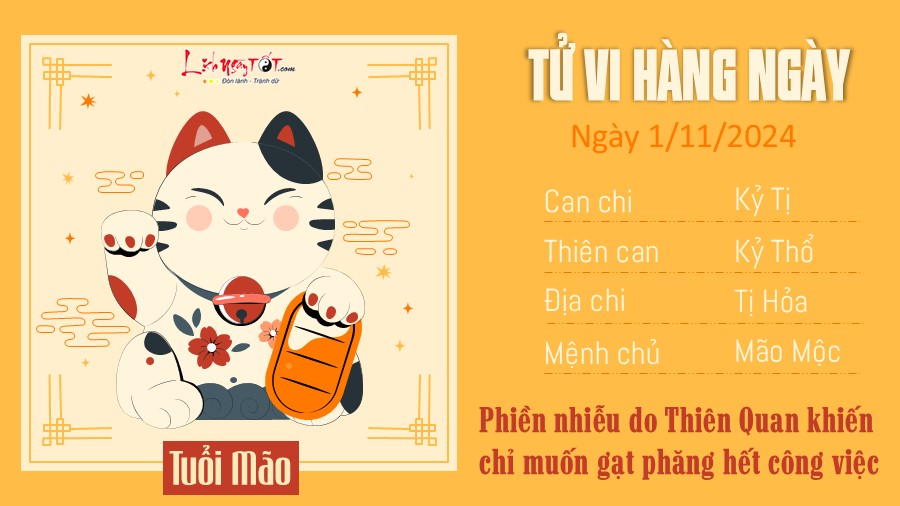 Phiền nhiễu do Thiên Quan gây ra khiến tuổi Mão lúc này chỉ muốn gạt phăng hết công việc sang một bên để ở nhà nghỉ ngơi. Có vẻ như đó chỉ là một mong muốn nhỏ bé nhưng trong thời điểm này, đừng xem nhẹ việc quan tâm đến bản thân và gia đình.