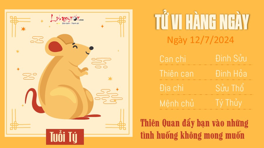 Ngày 12/7, Thiên Quan đẩy tuổi Tý vào những tình huống không mong muốn nhưng cũng là để nhắc nhở bạn phản luôn cẩn trọng, nhất là khi cuộc sống không phải khi nào cũng diễn ra theo cách bạn muốn. Đôi khi chấp nhận mọi thứ cũng là cách hay.