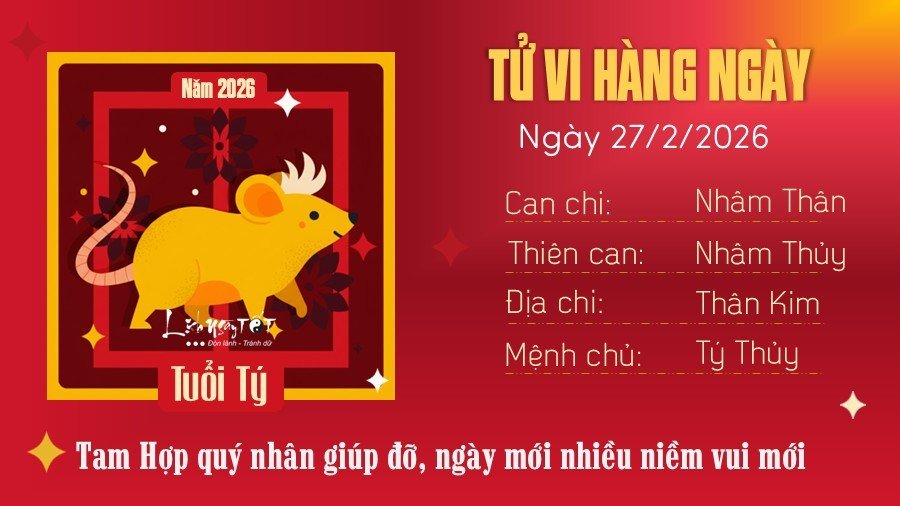 Tiếp nối tử vi ngày 26/2/2026, nay Kiếp tài nhắc nhở Tý làm gì cũng nên chừa cho mình một đường lui, đừng quá ám ảnh công việc, tối về đừng ôm việc vào nhà, hãy rũ bỏ mọi mệt nhọc ngoài cánh cửa nhà. Đặc biệt, con giáp này không nên ẩu trong vấn đề số liệu, giấy tờ, thuế má, vận chuyển trong ngày này.