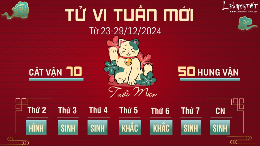 Tiền bạc của tuổi Mão khá dồi dào vào đầu tuần nhưng khó khăn sẽ đến với bạn nhiều nhất vào giữa tuần với ảnh hưởng của Kiếp Tài. Có thể vì buồn chán nên bạn có xu hướng mua sắm nhiều hơn để giảm bớt căng thẳng trong lòng.