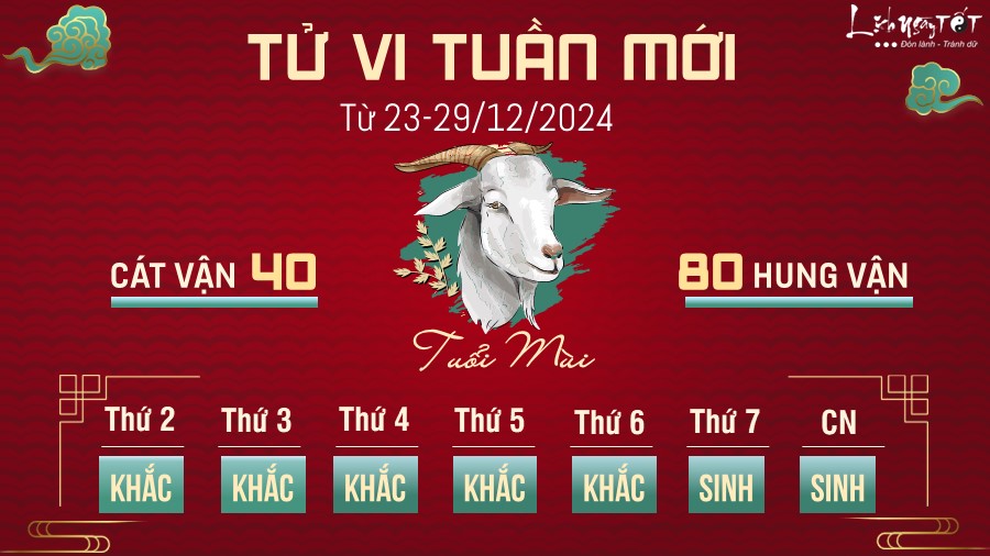 Tuổi Mùi tuần này có cảm giác bất công khi thấy rằng mình đã trao trọn tình cảm cho đối phương nhưng không được nhận về những gì tương ứng. Thực ra bạn đang đòi hỏi nhiều hơn so với thực tế, bạn cũng đã tự đánh mất niềm vui của mình chứ không ai ép bạn cả.