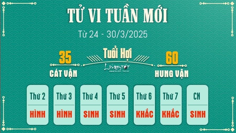 Hung tinh Ngũ Quỷ xuất hiện, người tuổi Hợi có thể gặp một số trở ngại nhỏ vào đầu tuần khiến cảm xúc của bạn thay đổi thất thường, nhưng chỉ cần bạn có thể điều chỉnh tâm lý và đối mặt với thử thách một cách tích cực, bạn có thể dần vượt qua khó khăn và phát triển tốt hơn.