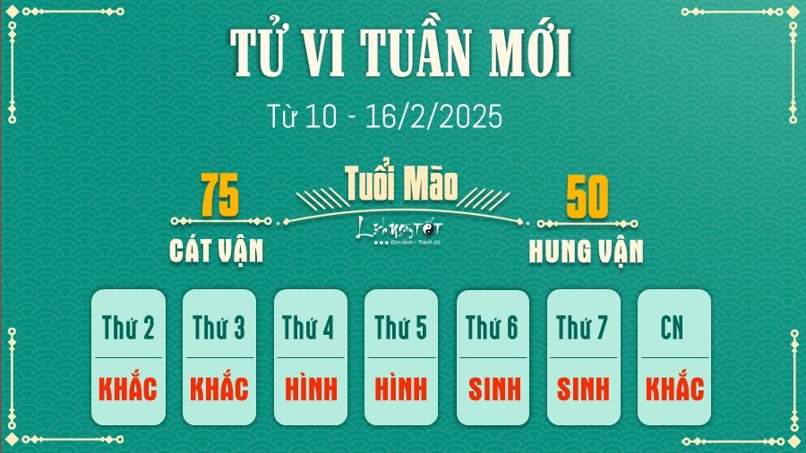 Tuần mới của người tuổi Mão được dự đoán khá lạc quan, là thời điểm tốt để thể hiện năng lực và sức hút của mình dưới sự bảo hộ của sao Bách Việt. Mặc dù đôi khi gặp phải một số trở ngại nhưng với sự kiên trì của mình, bạn có thể vượt qua chúng thành công và đạt được mục tiêu, ước mơ cá nhân.