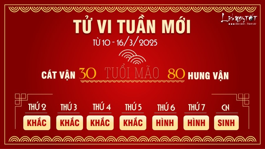 Thứ 7 là ngày đẹp nhất cho đường tiền bạc của Mão nhờ Tam Hợp cục chiếu cố. Nếu muốn mua bán xe cộ, nhà cửa, đất cát hãy chọn ngày thứ 7 của tuần này. Đầu tuần có điềm báo mất tiền vì vi phạm giao thông hoặc ốm đau bệnh tật, bản mệnh cần lưu tâm.