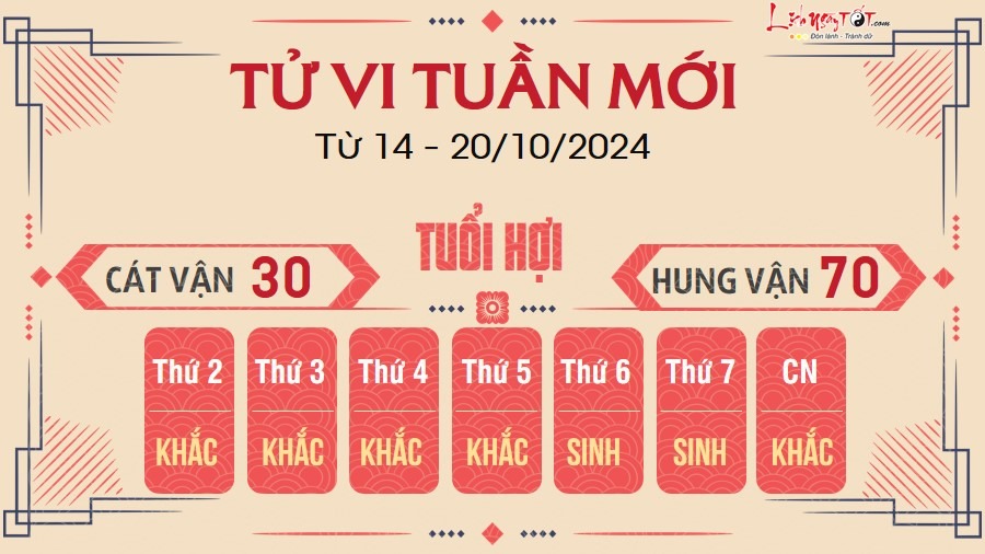 Tuần này là một tuần khá bình ổn đối với người tuổi Hợi. Khuyên bạn vẫn nên tập trung để làm cho tốt các công việc của mình, chớ nên lơ là kẻo mắc phải những lỗi sai không đáng có.
