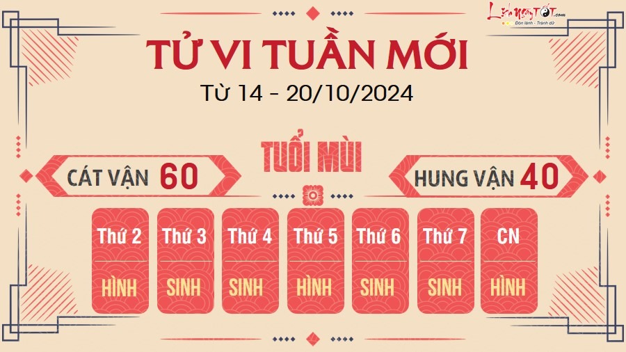 Người tuổi Mùi nhận được sự ưu ái của cấp trên trong tuần này, song điều đó có thể khiến cho một số kẻ xấu bụng ghen ghét. Tốt nhất bạn vẫn nên thận trọng trong mọi chuyện và chớ kiêu ngạo, làm mất lòng người khác.