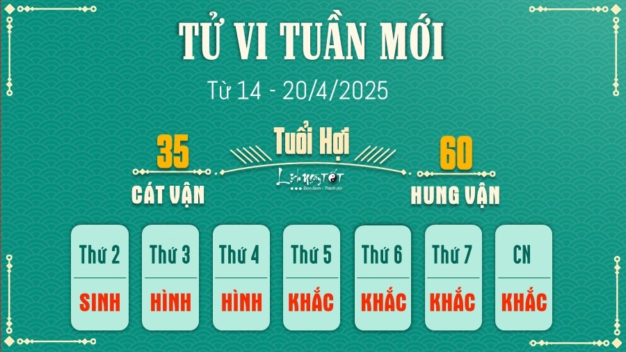 Tuần này, người tuổi Hợi có thể gặp phải sự cạnh tranh gay gắt trong công việc. Áp lực đến từ cạnh tranh nội bộ, môi trường thiếu sự hỗ trợ. Hãy tập trung vào việc hoàn thành tốt nhiệm vụ của mình và tránh xa những tranh chấp không cần thiết. Đề phòng những lời mời hợp tác hoặc đầu tư không rõ ràng.