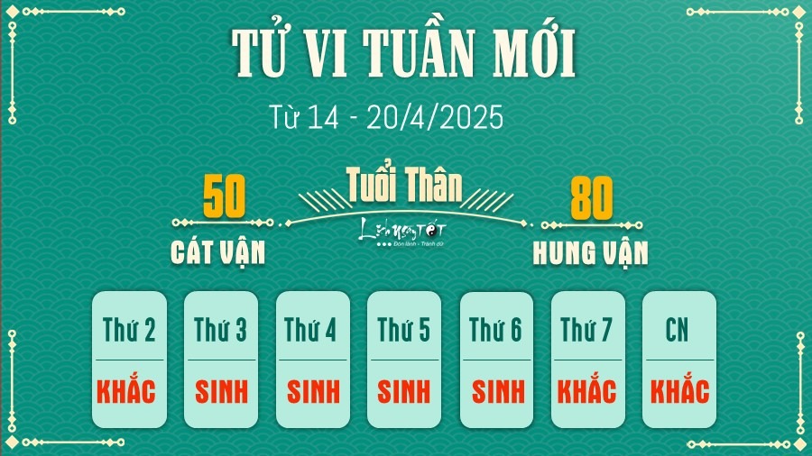 Tuần này, người tuổi Thân cần đặc biệt cẩn trọng trong công việc. Sao Bạch Hổ mang đến những nguy cơ về tai nạn, va chạm và xung đột. Hãy làm việc cẩn thận, tỉ mỉ và tránh những quyết định vội vàng. Đặc biệt, khi tham gia giao thông cần chú ý an toàn.